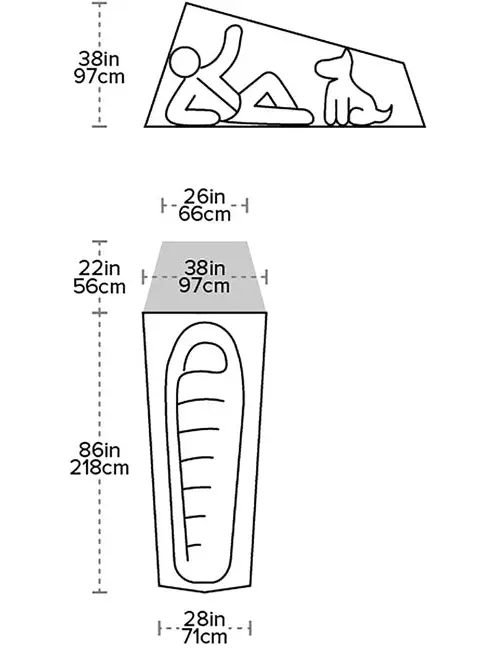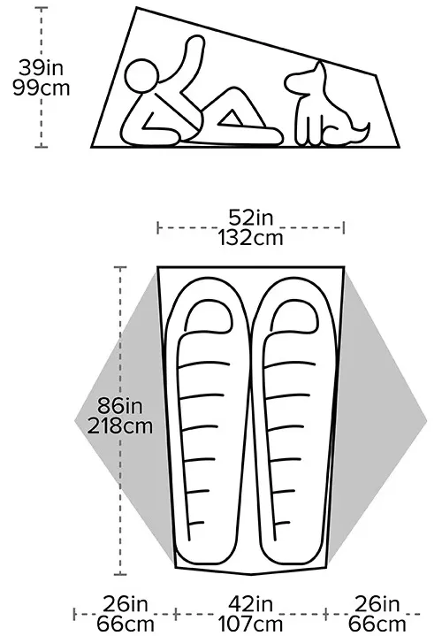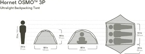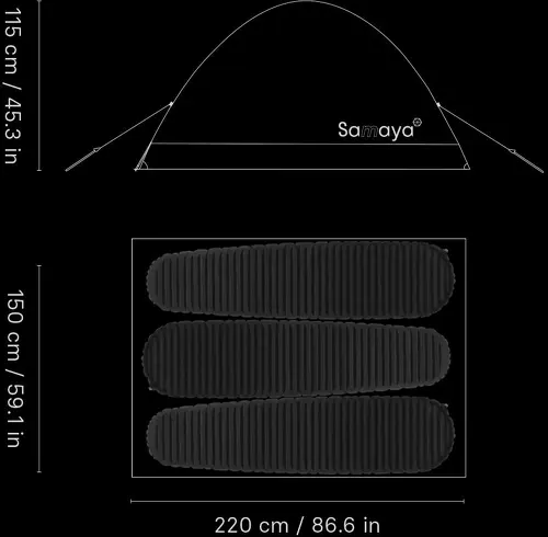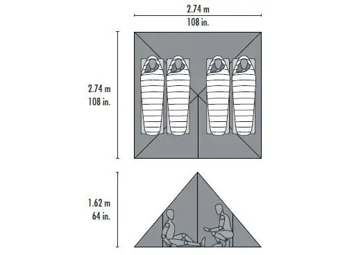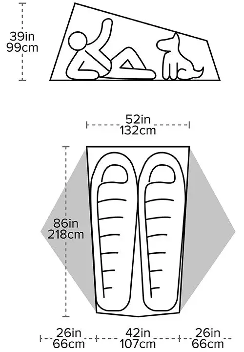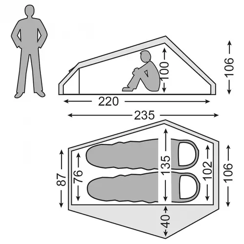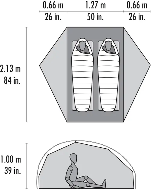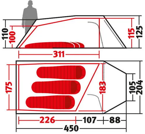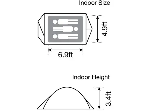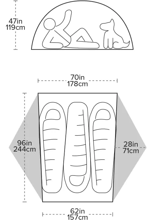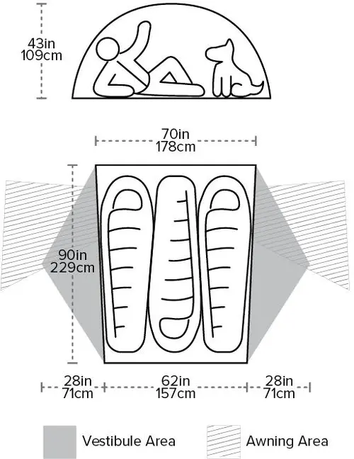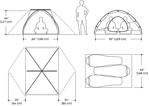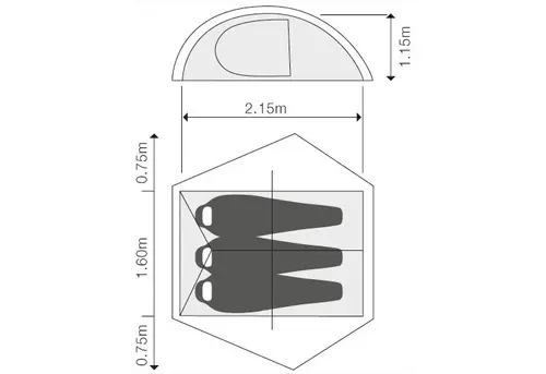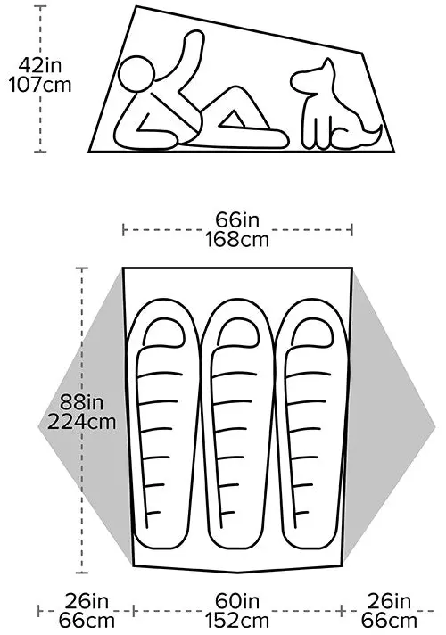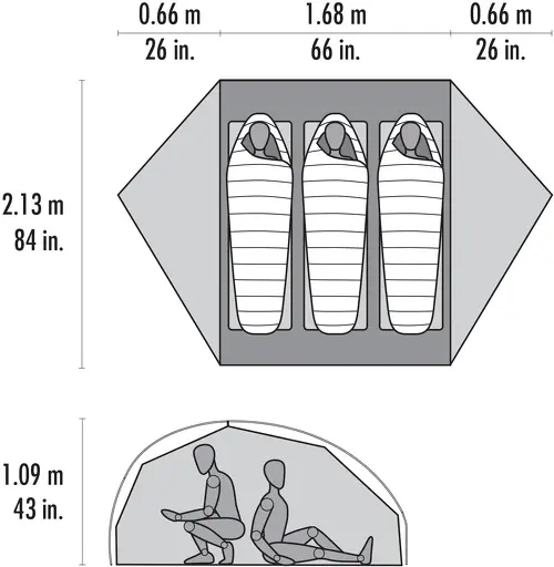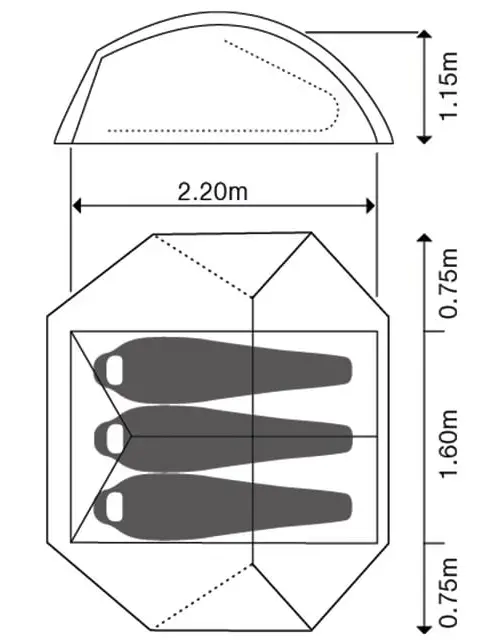 Deze afmetingen bieden een comfortabele ruimte voor drie personen, met ruimte voor standaard slaapmatten en wat extra uitrusting. Het ontwerp van de tent omvat verticale wanden, wat de stahoogte en de algehele leefbaarheid vergroot. Bij gebruik van brede slaapmatten is het meer een twee-persoonstent.